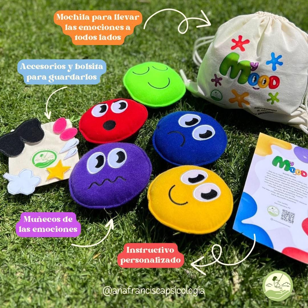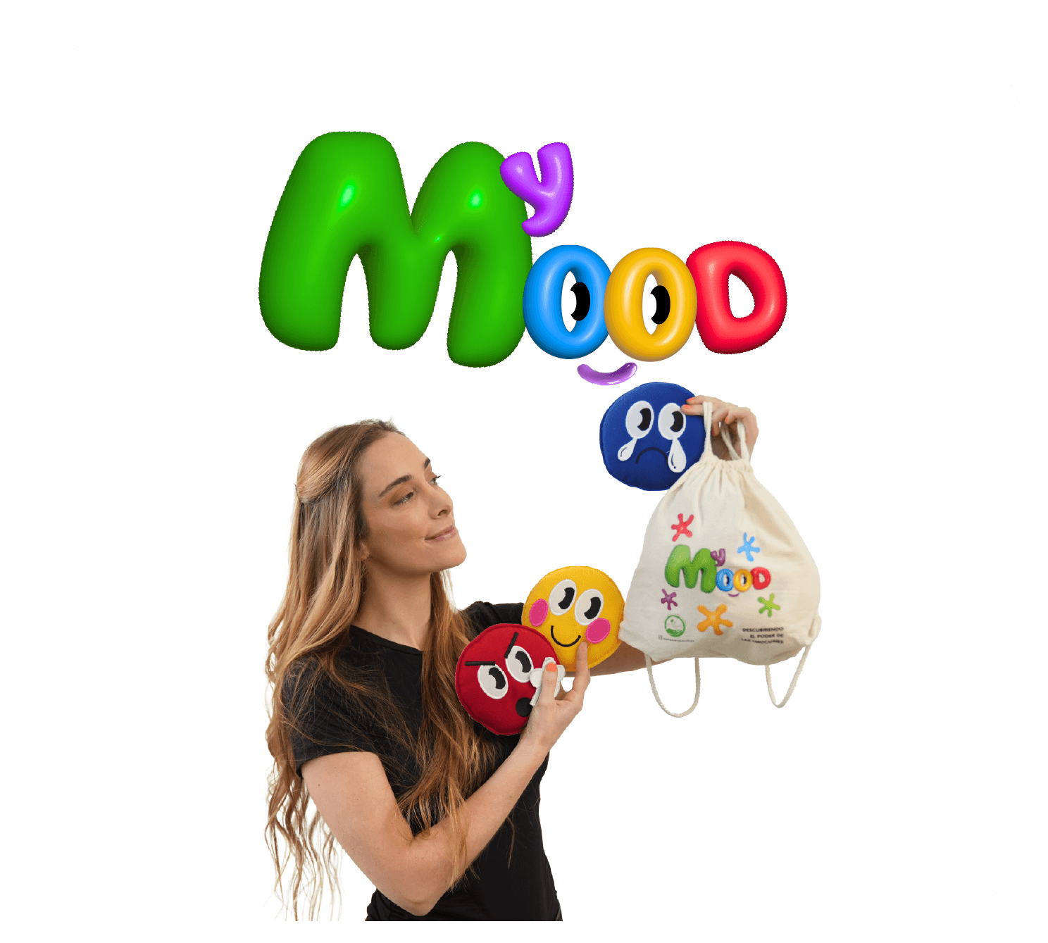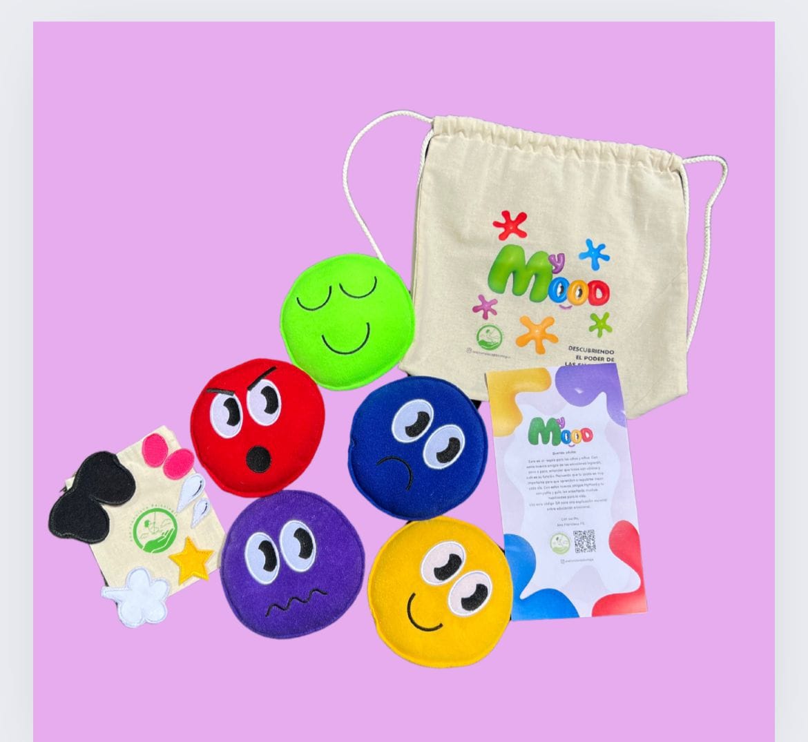 MyMood es un kit emocional infantil compuesto por cinco peluches redondos, cada uno representando una emoción básica: alegría, tristeza, miedo, enojo y calma. Cada peluche está acompañado de accesorios intercambiables con velcro para expresar diferentes estados. Ideal para trabajar inteligencia emocional en el hogar o en aulas.